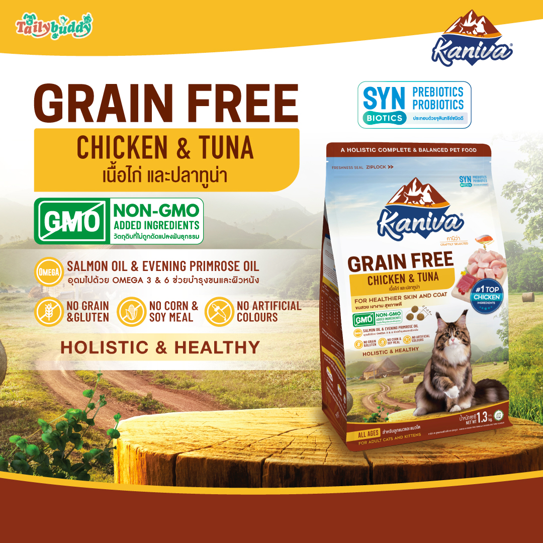Kaniva Grain Free อาหารแมวพรีเมียมที่อุดมไปด้วยคุณค่าสารอาหารตามมาตรฐานของกองควบคุมอาหารสัตว์เลี้ยงแห่งสหรัฐอเมริกา (AAFCO) ทางเราคัดสรรวัตถุดิบคุณภาพสูงเพื่อแมว "ขนสวย เงางาม สุขภาพดี" ทวีคูณความอร่อยให้น้องเหมียวด้วยเนื้อไก่ที่เป็นส่วนผสมหลัก มีโปรตีนสูงช่วยเสริมสร้างกล้ามเนื้อ แคลเซียมและฟอสฟอรัส เพื่อกระดูกและฟันที่แข็งแรง ไลซีนช่วยเสริมสร้างภูมิต้านทาน MOS พรีไบโอติกจากธรรมชาติ เสริมสร้างภูมิต้านทาน สร้างสมดุลในระบบทางเดินอาหาร ทั้งยังมีใยอาหารสูง ช่วยในเรื่องระบบขับถ่าย ลดการเกิดก้อนขน สารสกัดจากยัคคาเพิ่มระสิทธิภาพการย่อย ลดกลิ่นฉุนในปัสสาวะ และกลิ่นมูล ปราศจากส่วนผสมของธัญพืช ถั่วเหลือง ข้าวสาลีและข้าวโพด อุดมไปด้วยคุณค่าสารอาหาร ที่เหมาะสมสำหรับแมวทุกช่วงวัย