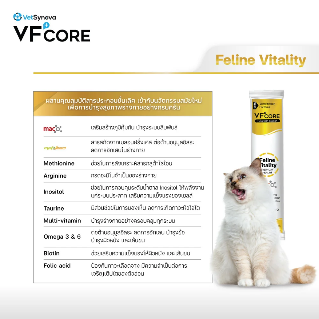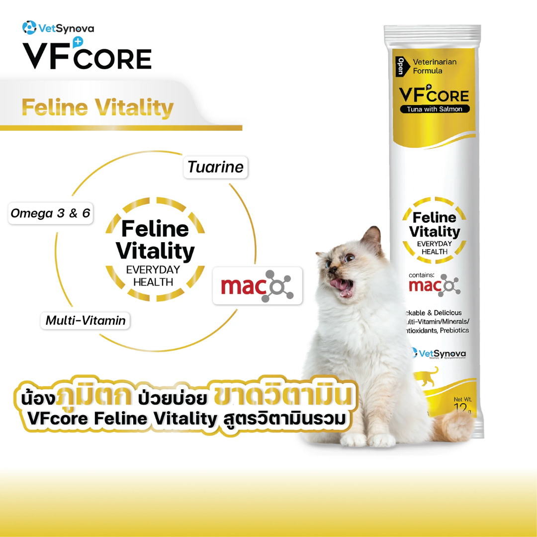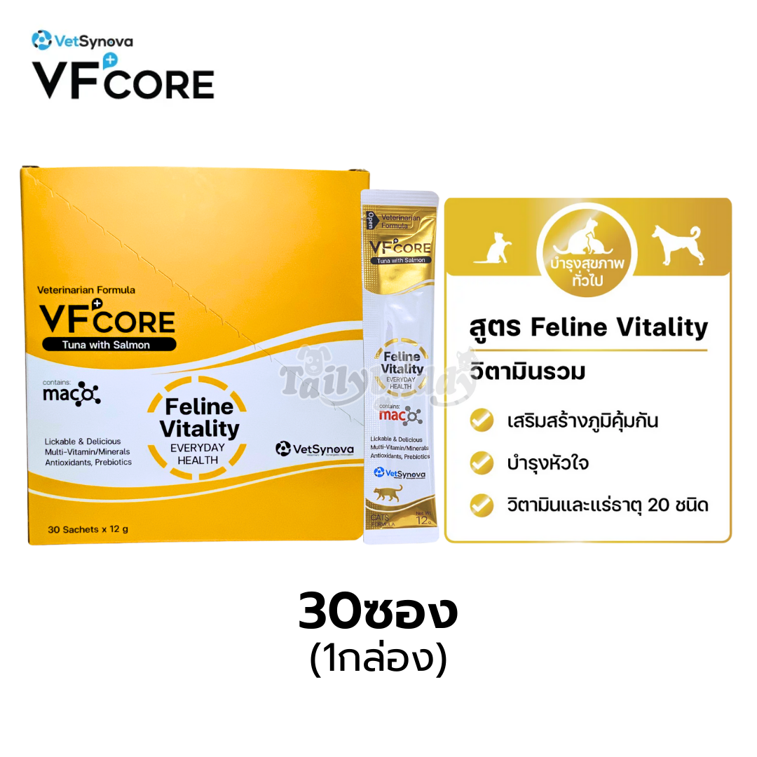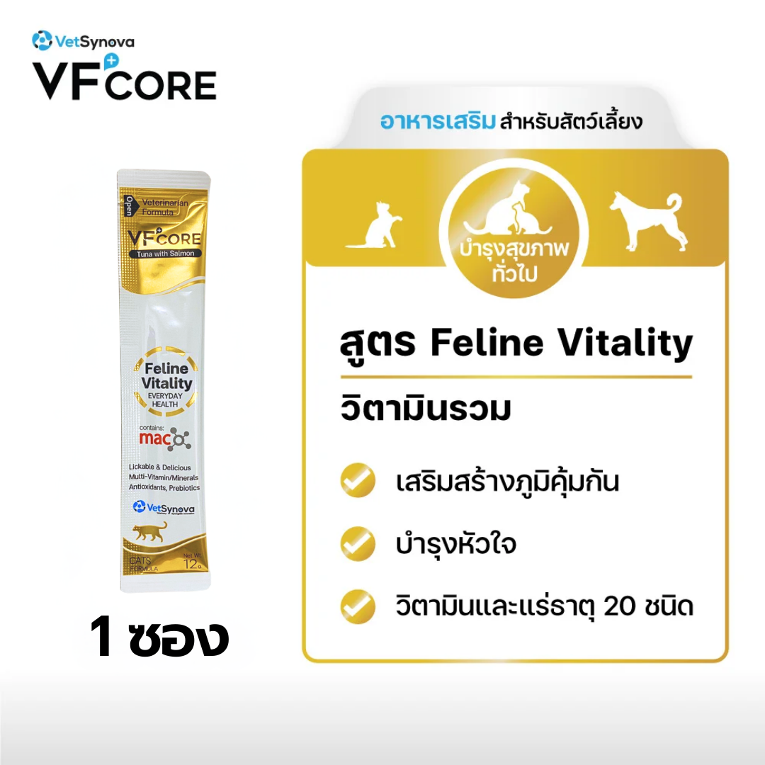VFcore (วีเอฟคอร์) อาหารเสริมแมวเลีย Feline Vitality มีวิตามินกว่า 20 ชนิด ช่วยบำรุงร่างกาย รสทูน่าและแซลมอน (12g)