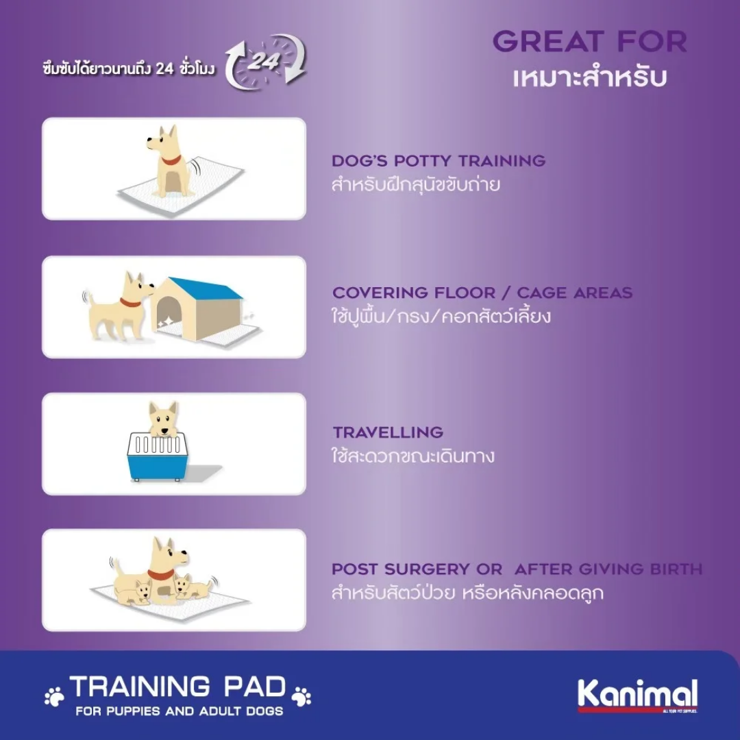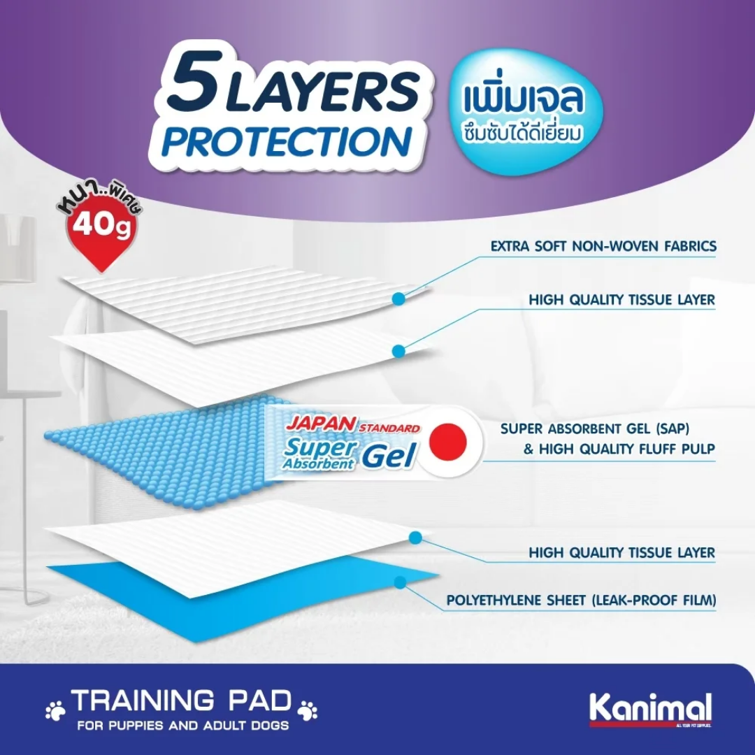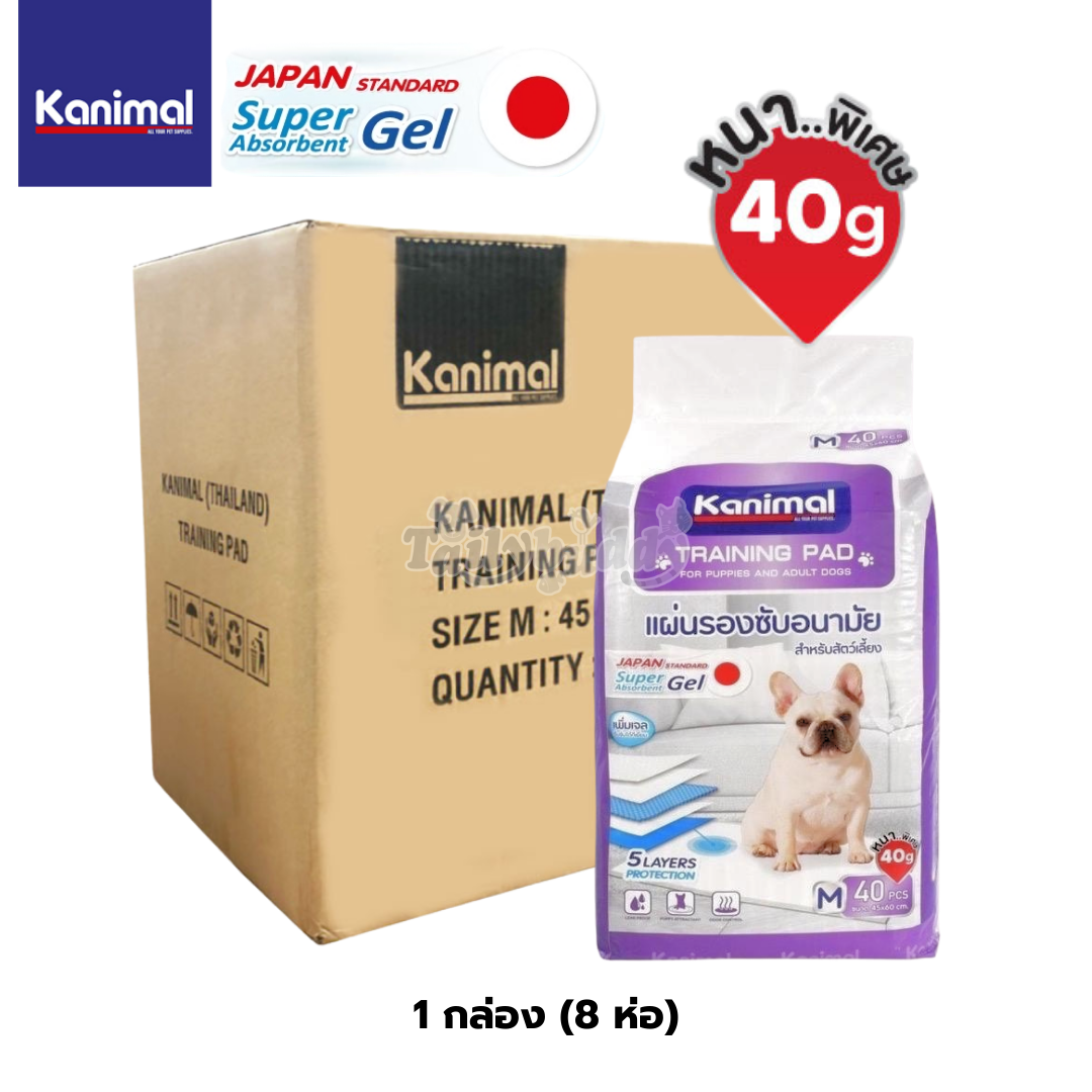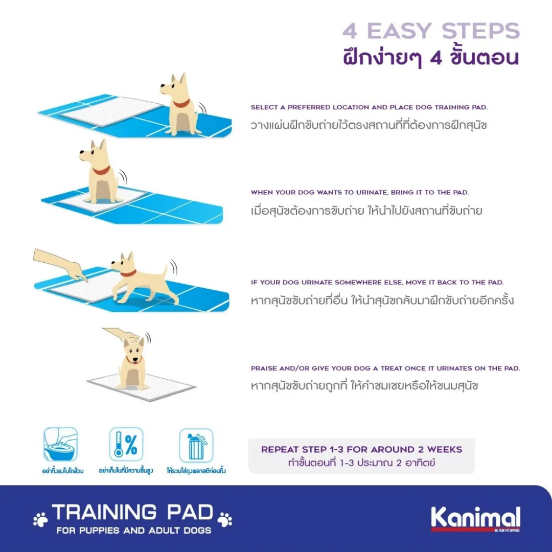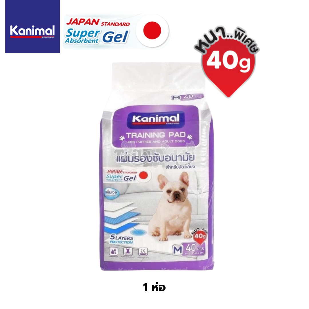 Kanimal Training Pad แผ่นรองฉี่สุนัข แผ่นรองซับสัตว์เลี้ยง รุ่นหนาพิเศษ 40 กรัม สำหรับสุนัข Size M ขนาด 45x60 ซม. (40 แผ่น/ แพ็ค)หมดปัญหาเช็ด ถูฉี่น้องหมาให้วุ่นวาย ด้วยแผ่นรองฉี่คุณภาพมาตรฐาน ซึบซับได้รวดเร็วช่วยให้ฉี่น้องหมาไม่ไหลเปรอะเปื้อน และไม่รั่วซึมลงสู่พื้นด้านล่าง ตัวแผ่นมีขนาดหนาพอประมาณ ควรใช้วันต่อวัน