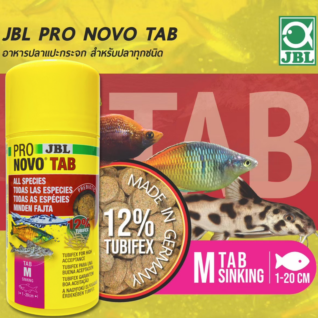 JBL PRONOVO TAB เป็นอาหารเม็ดแบบจมน้ำ เหมาะสำหรับปลาที่อยู่บริเวณกลางและก้นตู้ทุกชนิด ใช้ได้ทั้งปลาทะเลและปลาน้ำจืด และยังสามารถติดที่กระจกตู้ปลา เพื่อให้ปลาชนิดอื่นๆ กินได้ง่าย มีส่วนผสมจากธรรมชาติ ไม่มีสารเติมแต่งเทียม ช่วยให้ปลามีสุขภาพดีและเจริญเติบโตได้ดีคุณสมบัติหลัก: