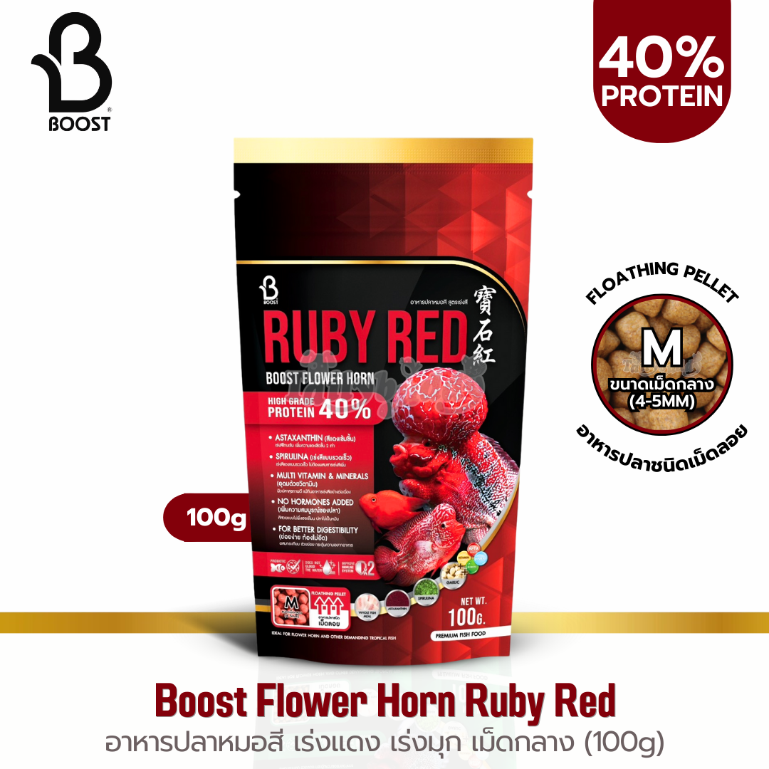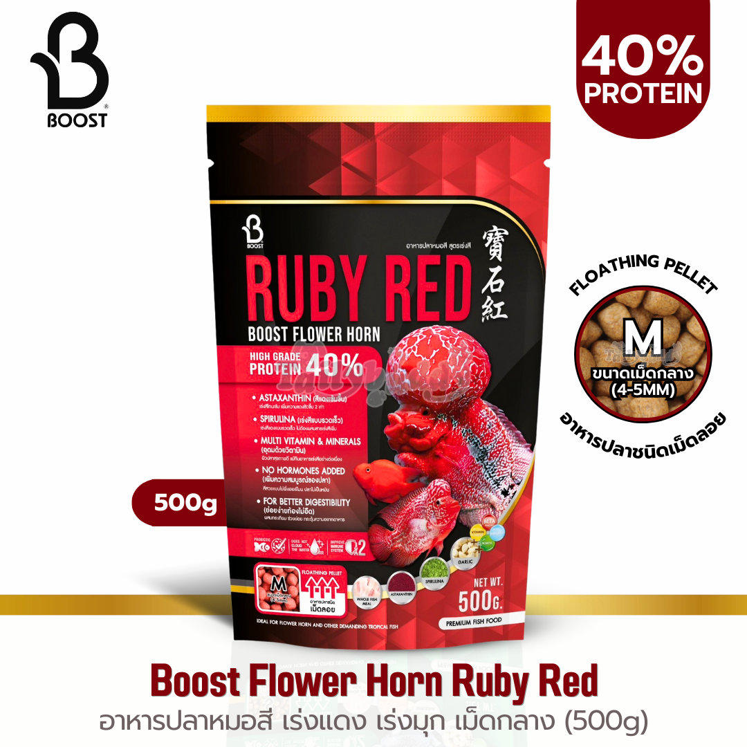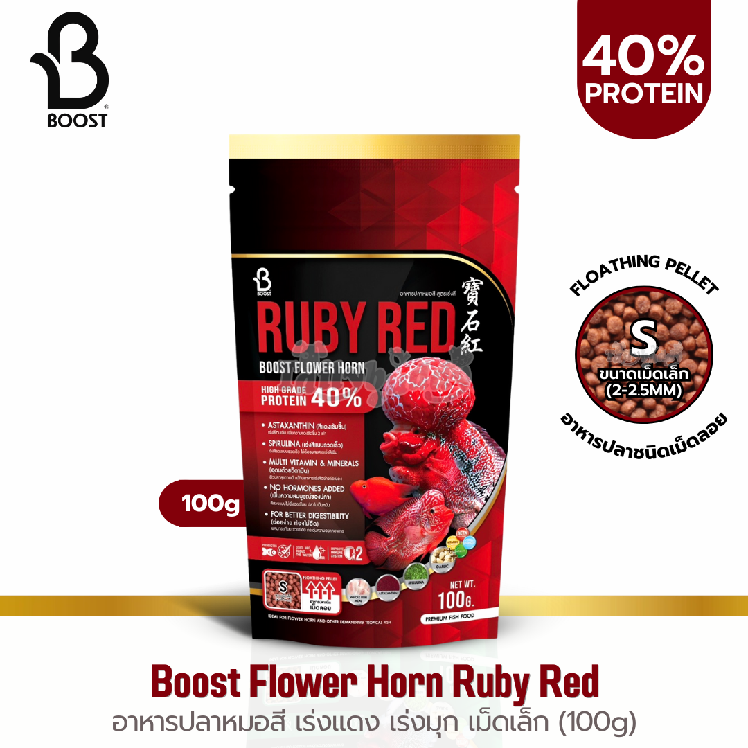 Boost Flower Horn สูตร Ruby Red อาหารปลาหมอสี เร่งแดง เร่งมุก สวยขึ้นใน 10 วัน เม็ดลอย (เม็ด S, เม็ด M) (100g, 500g)
