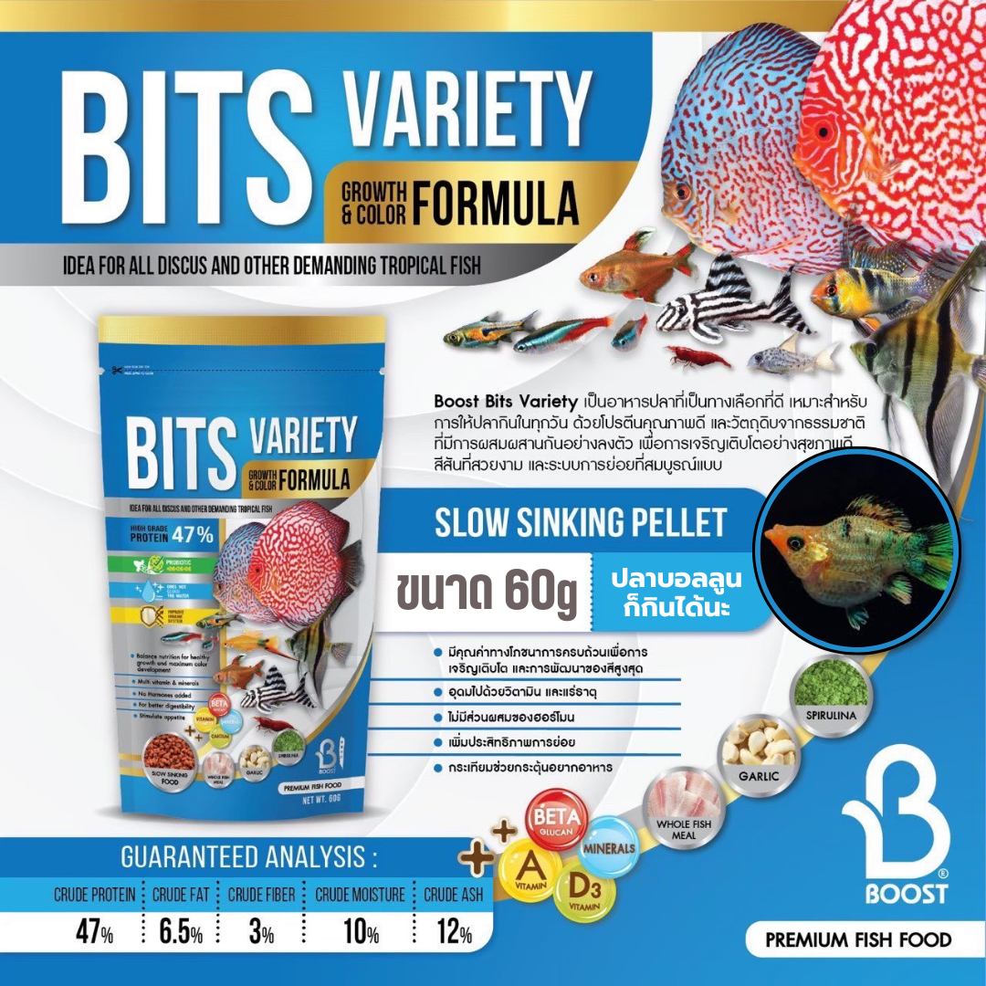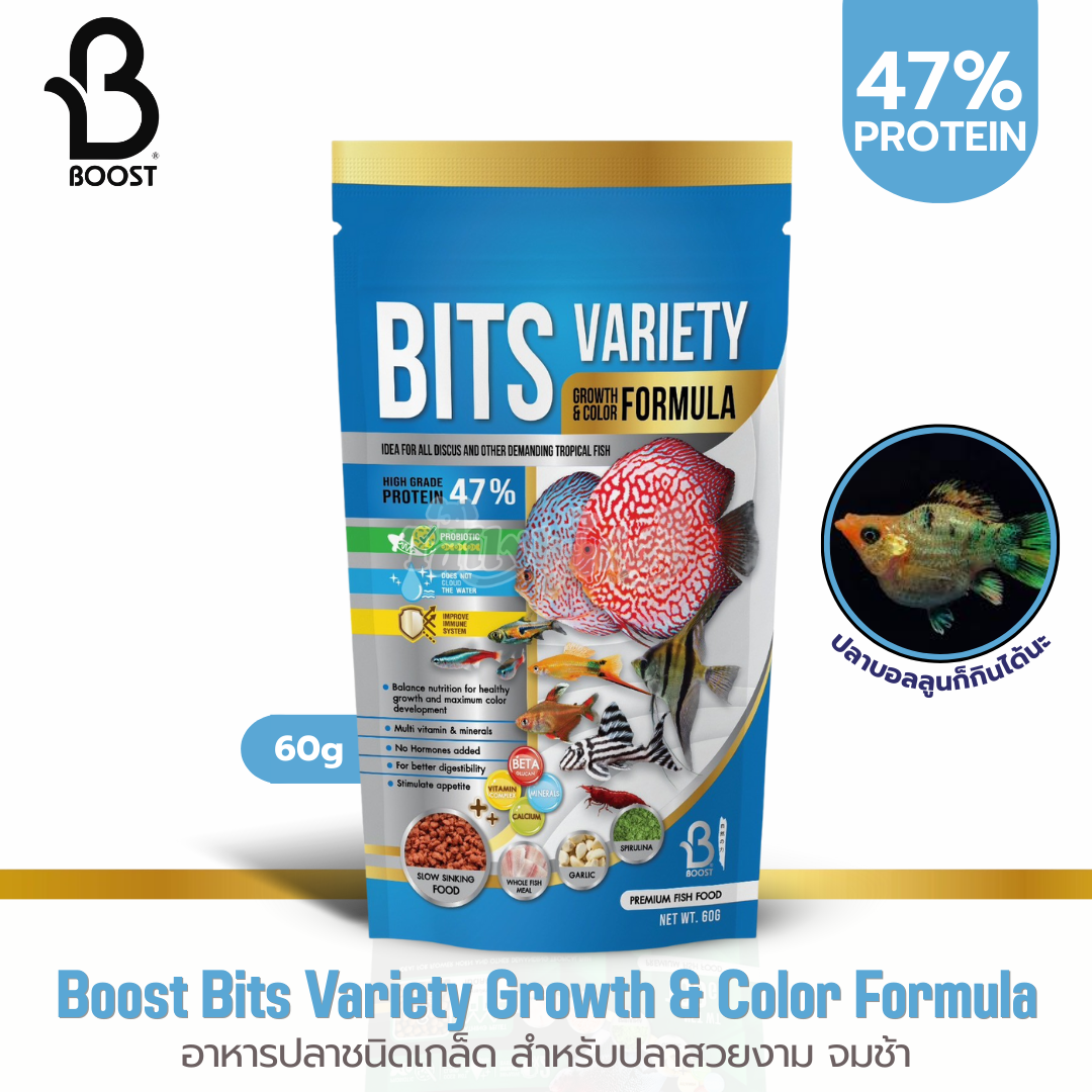 Boost Bits Variety Growth & Color Formula อาหารปลาชนิดเกล็ด สำหรับปลาสวยงาม โดยเป็นอาหารปลาชนิดเม็ดหรือเกล็ดเล็กๆ ข้อดีคือตัวเม็ดจะค่อยๆ จมลง เหมาะกับปลาที่กินกลางน้ำ เช่น ปลาเทวดา ปลาปอมปาดัวร์ ปลานีออน ปลาคาร์ดินัล เป็นต้น เป็นทางเลือกที่ดีสำหรับการให้ปลากินในทุกวัน เสริมด้วยโปรตีนคุณภาพ และวัตถุดิบจากธรรมชาติที่มีการผสมผสานกันอย่างลงตัว เพื่อการเจริญเติบโตอย่างสุขภาพดี สีสันที่สวยงาม และระบบการย่อยที่สมบูรณ์แบบ