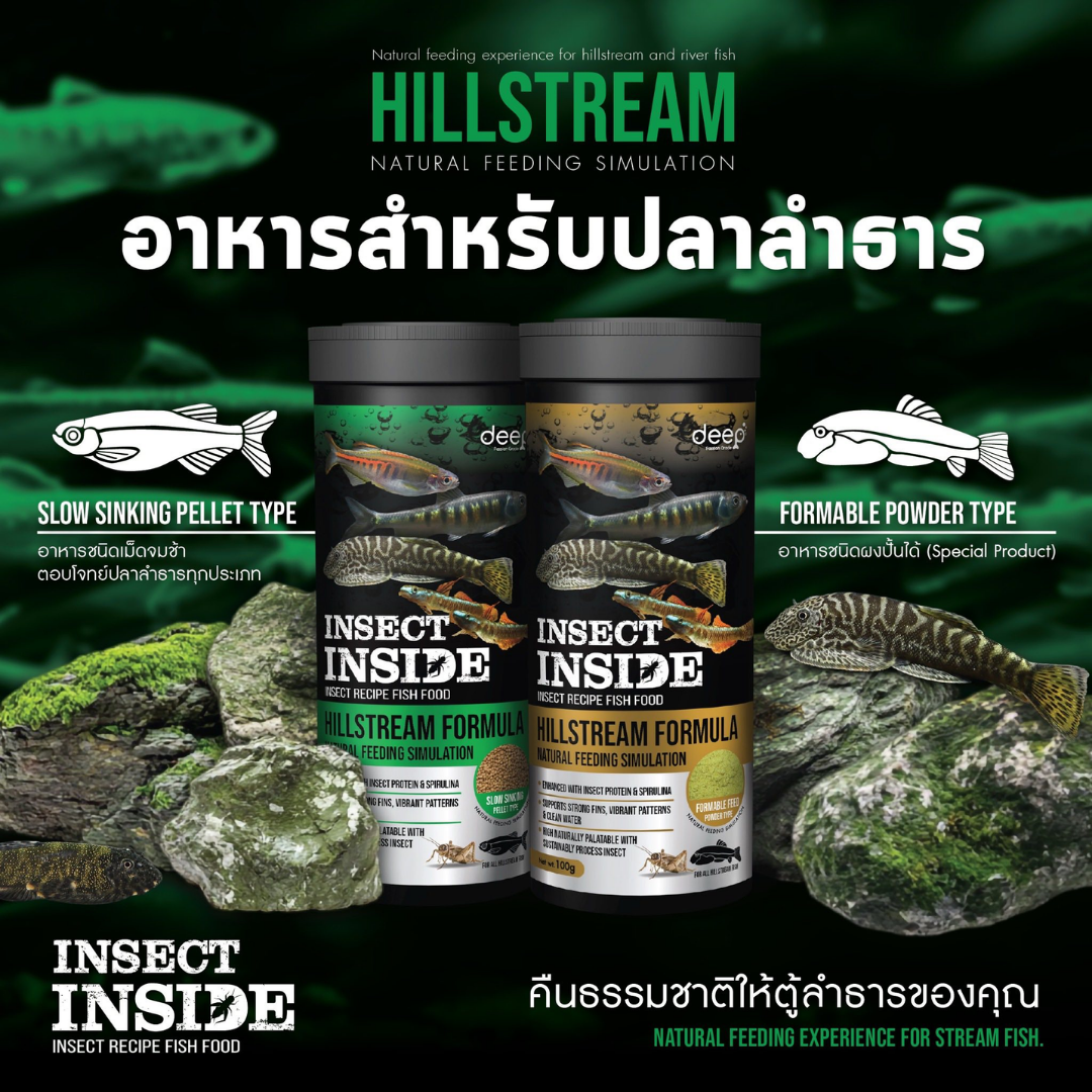 DEEP HILLSTREAM FORMULA อาหารปลาลำธารสูตรพิเศษ โปรตีนจากธรรมชาติ ด้วยส่วนผสมของ จิ้งหรีด ออกแบบมาเพื่อจำลองพฤติกรรมการกินอาหารตามธรรมชาติ เสมือนการเล็ม Biofilm ในลำธารจริง มี 2ชนิด1. สูตรอาหารปั้น ชนิดผง (ขวดเหลือง) 100g
