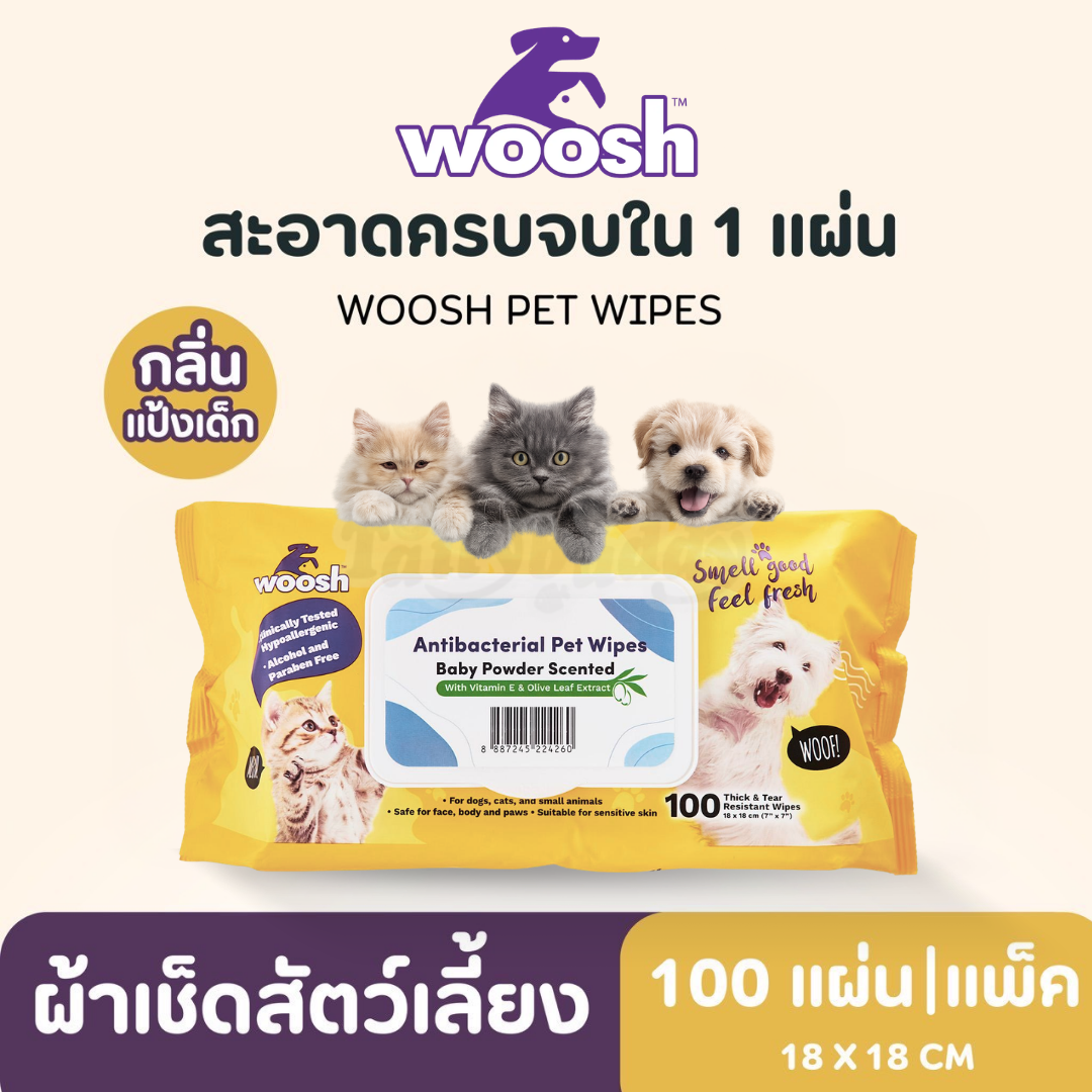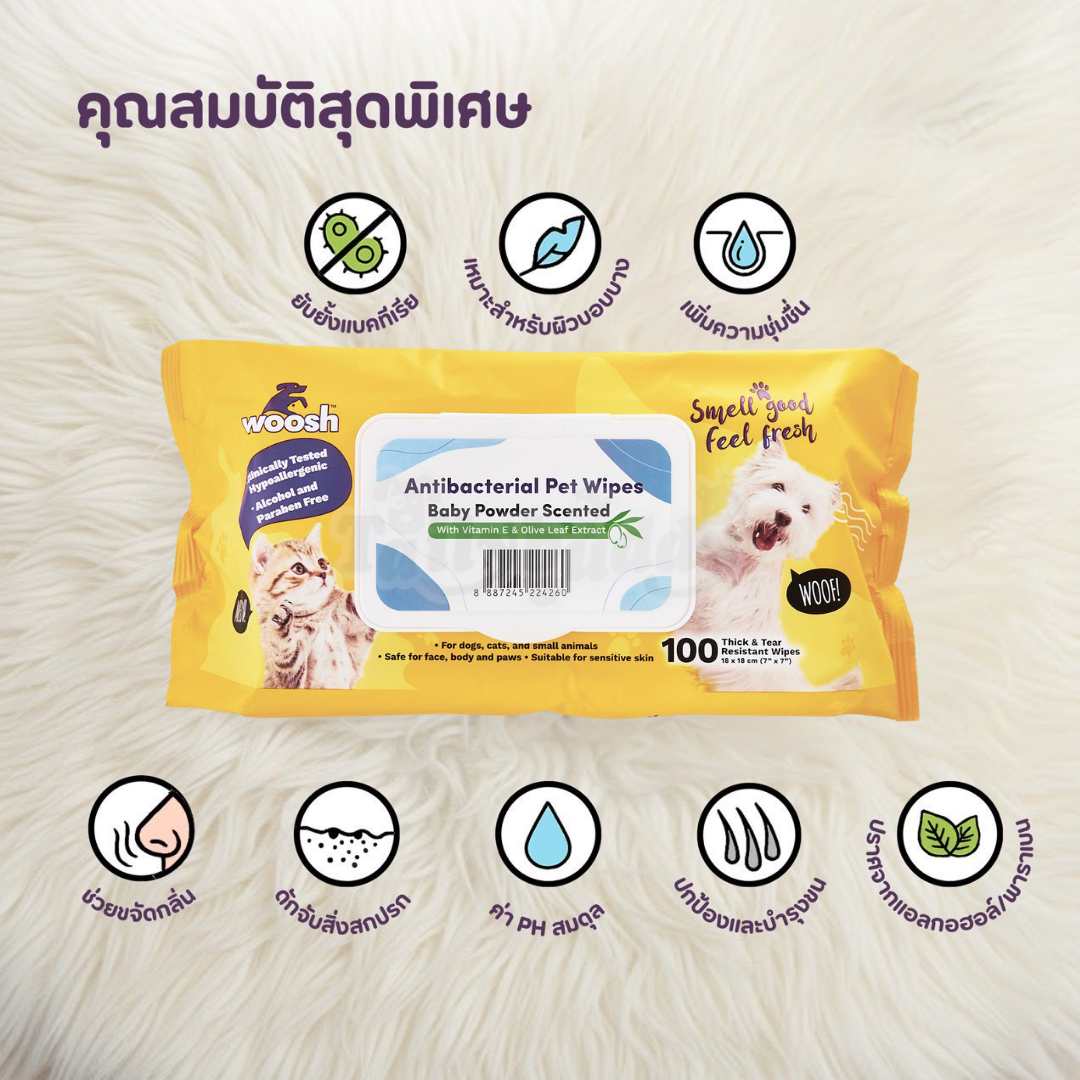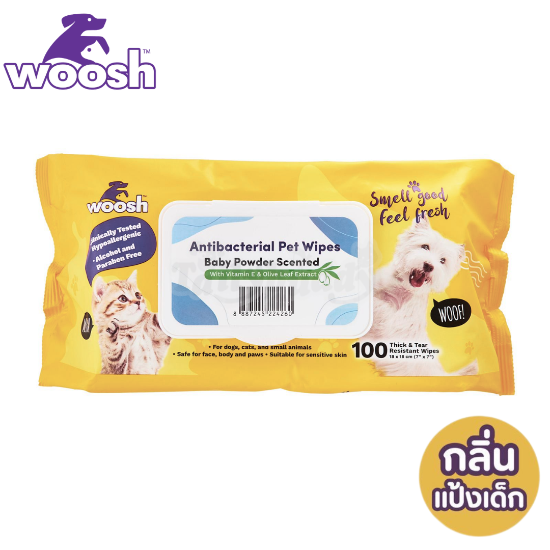 Woosh Antibacterial Pet Wipes baby powder sented ทิชชู่เปียกสำหรับสัตว์เลี้ยงสูตรแอนตี้แบคทีเรีย ออกแบบมาเพื่อการทำความสะอาดและลดกลิ่นได้อย่างง่ายดาย สำหรับสุนัข แมว และสัตว์เลี้ยงขนาดเล็กอื่น ๆ