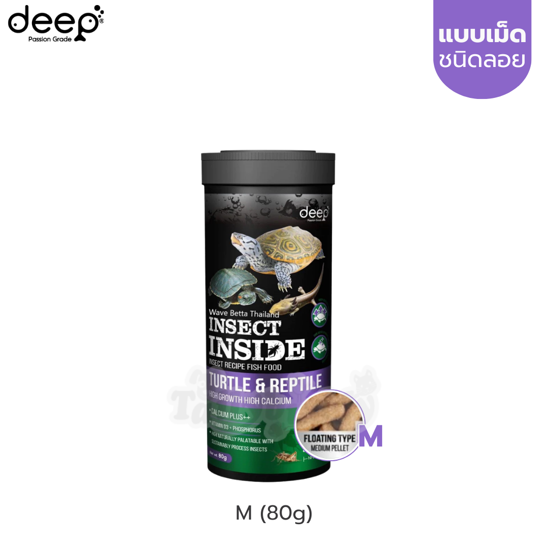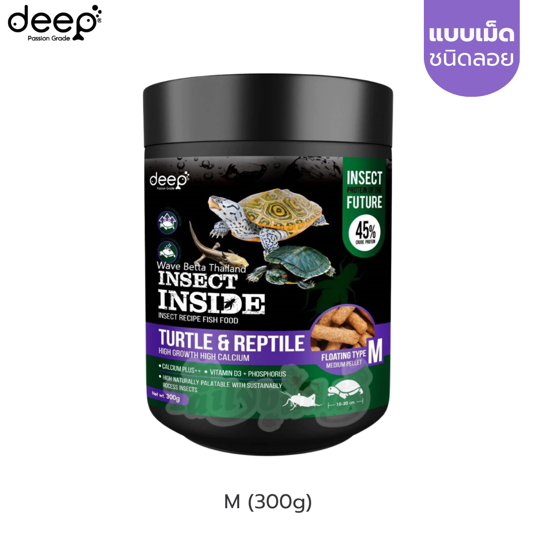 Deep Turtle & Reptile สูตรโตไว แคลเซียมสูง สำหรับเต่าน้ำและสัตว์เลื้อยคลาน ผสมโปรตีนจากจิ้งหรีด แบบลอย (เม็ดเล็ก, เม็ดกลาง) (80g, 300g)
