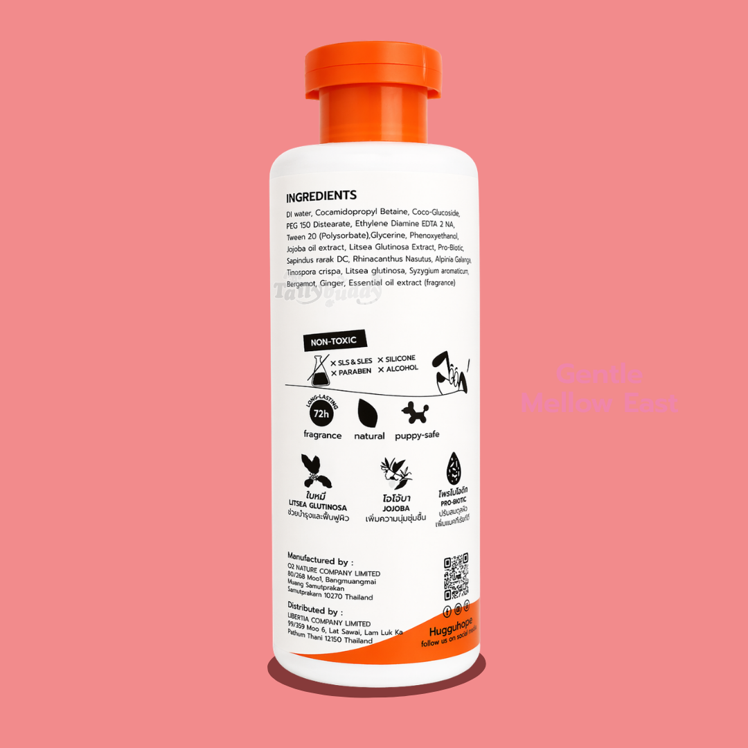 INGREDIENTS: Of water Cocamidopropyl Betaine, Coco-Glucoside, PEG 150 Distearate, Ethylene Diamine EDTA 2 NA, Tween 20 (Polysorbate), Glycerine, Phenoxyethal, Jojoba oll extract, Litsea Glutinosa Extract, Pro-Biotic, Sapindus rarak DC, Rhinacanthus Nasutus, Alpinia Calanga, Tnospora crispa, Litsea glutinosa, Syzygium aromaticum, Bergamot, Ginger, Essential oi extract (fragrance)