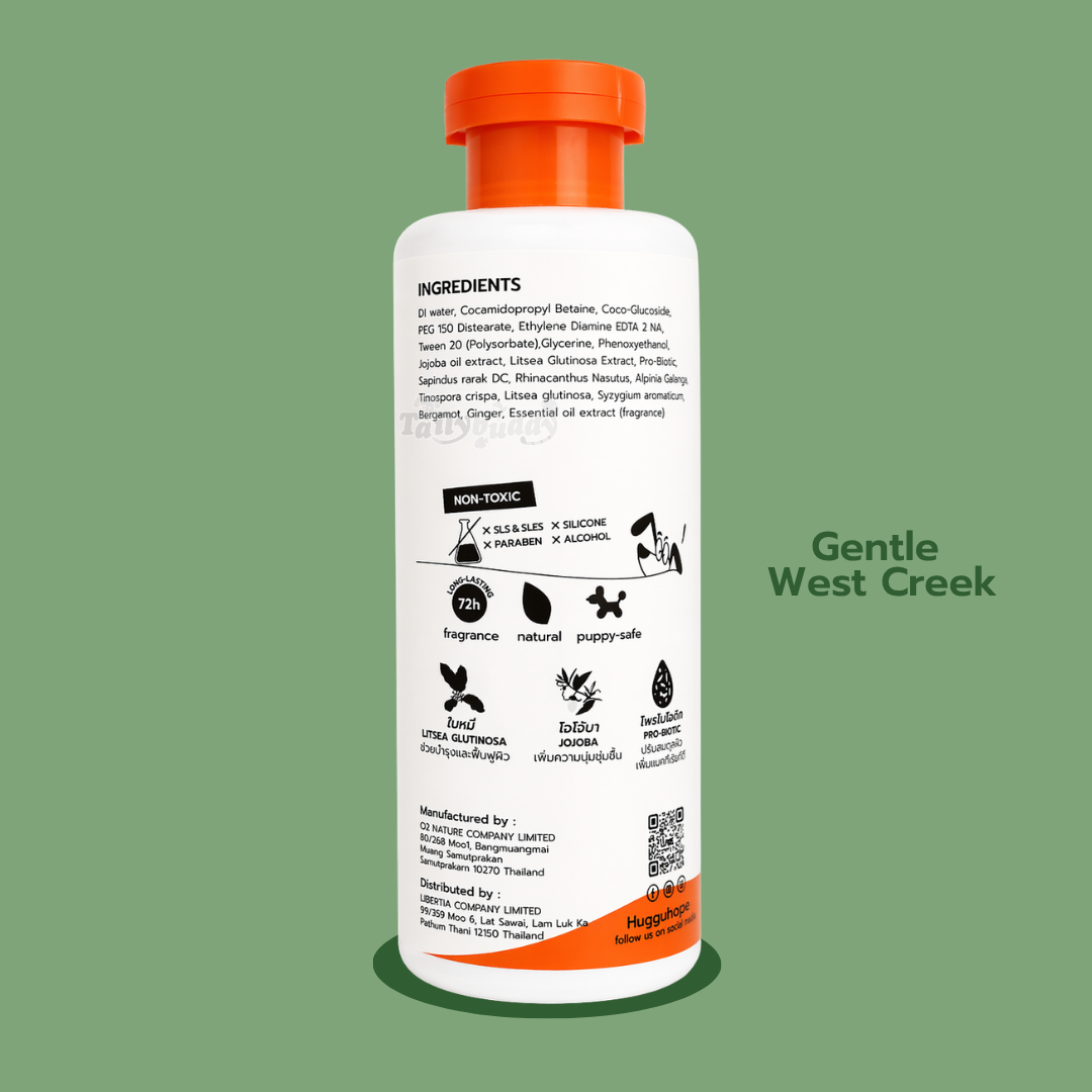Gentle West Creek (เขียว) INGREDIENTS: DI water, Cocamidopropyl Betaine, Coco-Glucoside, PEG 150 Distearate, Ethylene Diamine EDTA 2 NA Tween 20 (Polysorbate), Glycerine, Phenoxyethanol, Jojoba oll extract, itsea Glutinosa Extract, Pro-Biotic, Sapindus rarak DC. Rhinacanthus Nasutus, Alpinia Galanga, Tinospora crispa, Litsea glutinosa, Syzygium aromaticum, Bergamot, Ginger, Essential oil extract (fragrance)