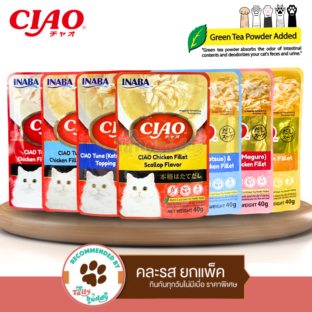 - CIAO เชา อาหารเปียกสำหรับแมว แบบซุปข้น รสปลาทูน่าคัทสึโอะ และเนื้อสันในไก่หน้าปลาโอแห้ง (40g)