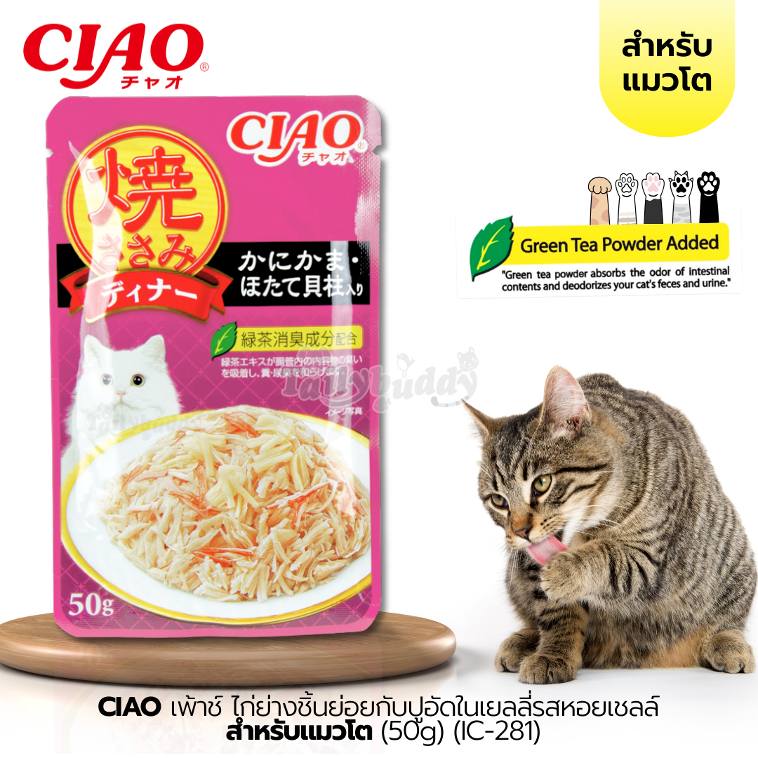 CIAO เพ้าช์ - ไก่ย่างชิ้นย่อยกับปูอัดในเยลลี่รสหอยเชลล์ อาหารเปียกสำหรับแมวโต (50g) (IC-281)