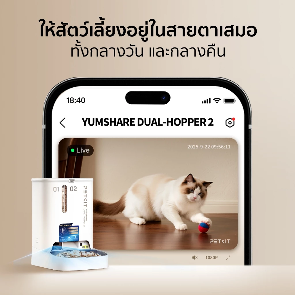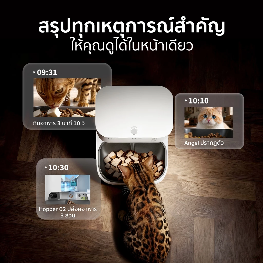 - คุณสามารถใช้กล้อง AI เพื่อตรวจดูสภาพของสัตว์เลี้ยงแบบเรียลไทม์ตลอด 24 ชั่วโมง หรือพูดคุยกับสัตว์เลี้ยงผ่านเสียง (บางรุ่นอาจไม่มีฟังก์พูดคุย) นอกจากนี้ เรายังมีบริการดูวิดีโอย้อนหลังฟรี 1 วัน หากต้องการดูวิดีโอย้อนหลังระยะยาวมากกว่า 1 วัน สามารถสมัครบริการ PETKIT CARE+ (ราคาเริ่มต้นประมาณ 66 บาท/เดือน)