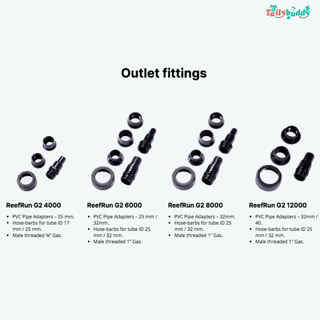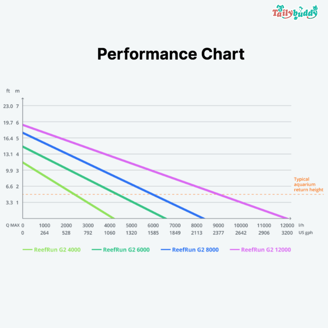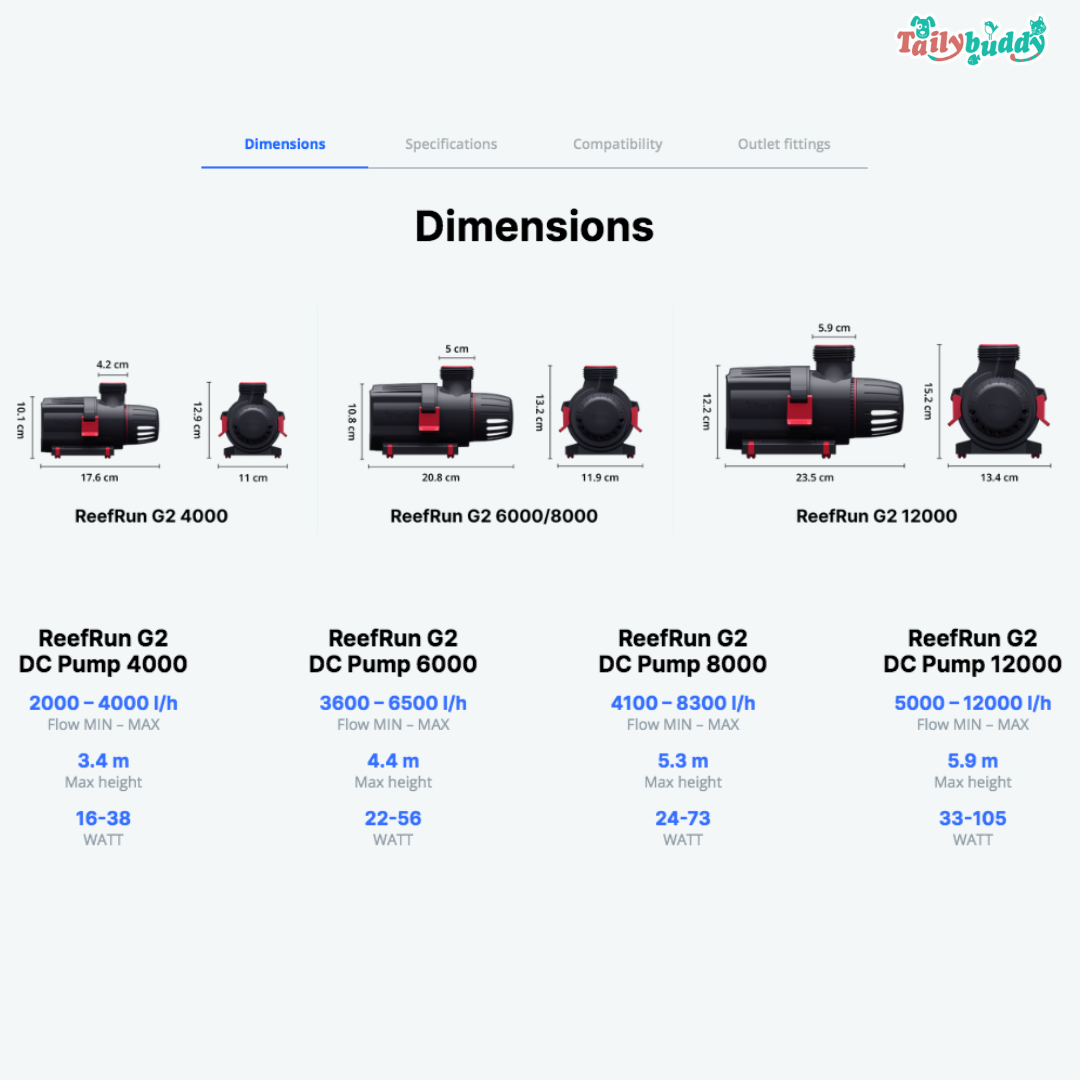 ReefRun DC pump G2 4000 2000 - 4000 L/ h 3.4m 16 - 38 WReefRun DC pump G2 6000 3600 - 6500 L/ h 4.4m 22 - 56 WReefRun DC pump G2 8000 4100 - 8300 L/ h 5.3m 24 - 73 W
