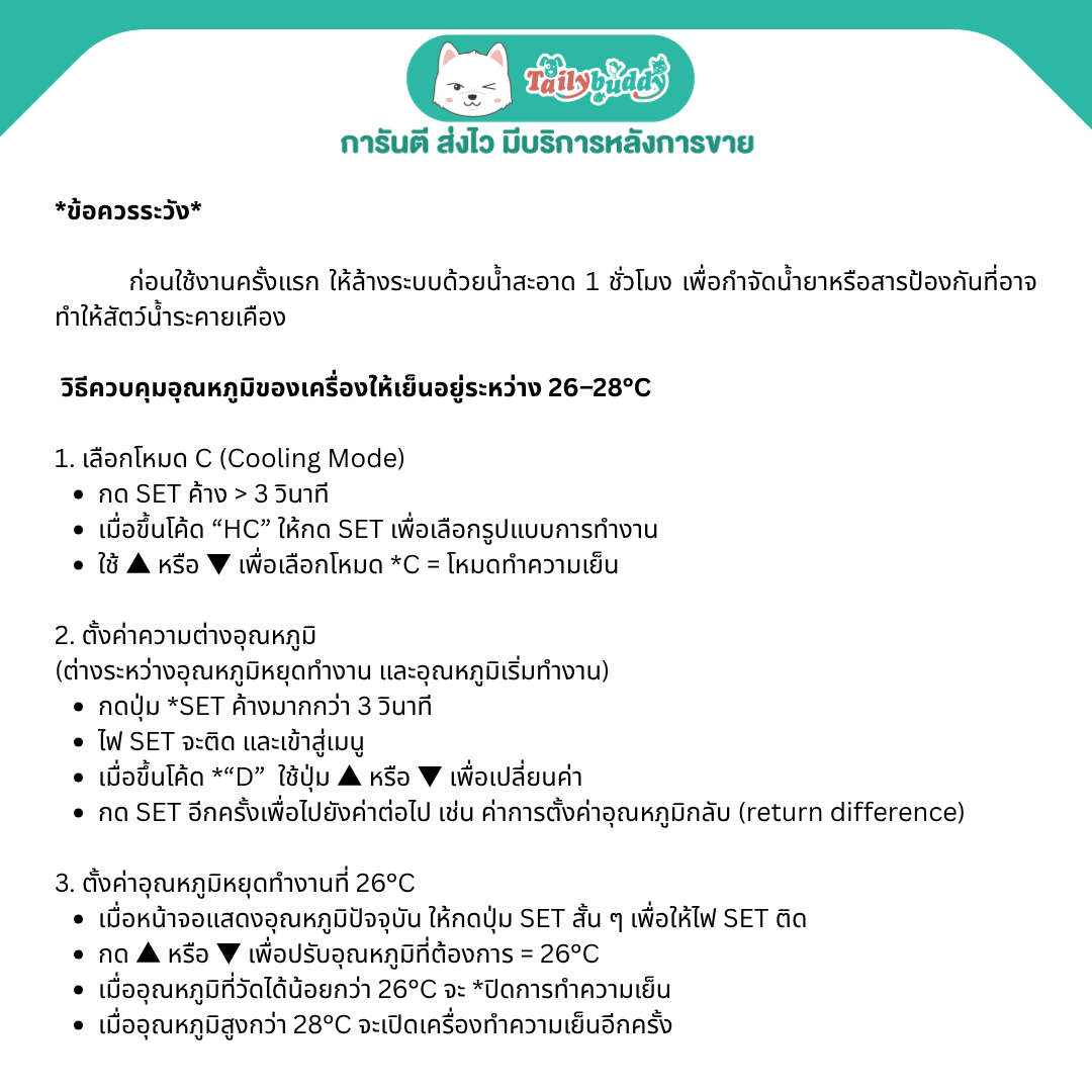 - อัตราการไหล: 120–300 L/h ช่วงอุณหภูมิที่ตั้งได้: 20°C – 30°C