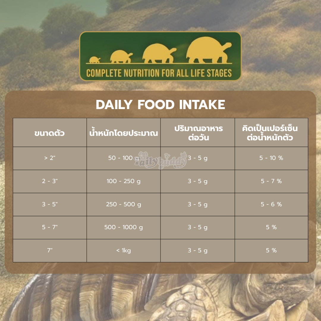 - เต่าบกควรกินอาหารประมาณ 1-5% ของน้ำหนักตัวต่อวัน โดยปริมาณอาจเปลี่ยนตามอุณหภูมิ และช่วงวัย