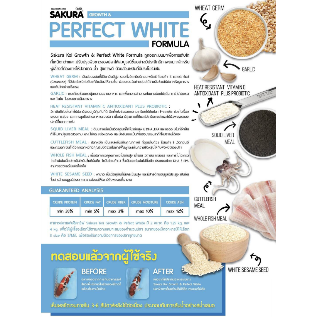 SAKURA KOI Growth & Perfect White Formula อาหารปลาคาร์ฟสูตรเร่งโต ปรับผิวขาว (เม็ดลอย) เปลี่ยนปลาเหลืองเป็นปลาขาว พร้อมการเติบโตที่ยอดเยี่ยมด้วย Sakura Koi Growth & Perfect White Formula เม็ดลอย ออกแบบเพื่อการเติบโตที่เหนือกว่า พร้อมปรับผิวขาวของปลาให้สมบูรณ์ขึ้นอย่างมีประสิทธภาพ เหมาะสำหรับผู้เลี้ยงที่ให้อาหารปลาเร่งสีมานานจนผิวปลาเริ่มเหลือง และอยากบำรุงผิวปลาให้ขาวสว่าง สดใสขึ้น จากภายในสู่ภายนอก โดยที่ยังคงรักษาการเติบโตของปลาเอาไว้ได้เป็นอย่างดี ด้วยวัตถุดิบที่มีคุณภาพอย่าง วีทเจิร์ม, กระเทียม, Heat ressistant vitamin C antioxidant, วิตามิน E, เนื้อปลาหมึก, งาขาว, ตับปลาหมึก สูตรเร่งขาว สามารถให้ได้ทุกสภาพอากาศเนื่องจากอุดมไปด้วย วิตามิน C และ E ช่วยลดความเครียดของปลาส่วนประกอบสำคัญ Sakura Koi Growth & Perfect White Formula
