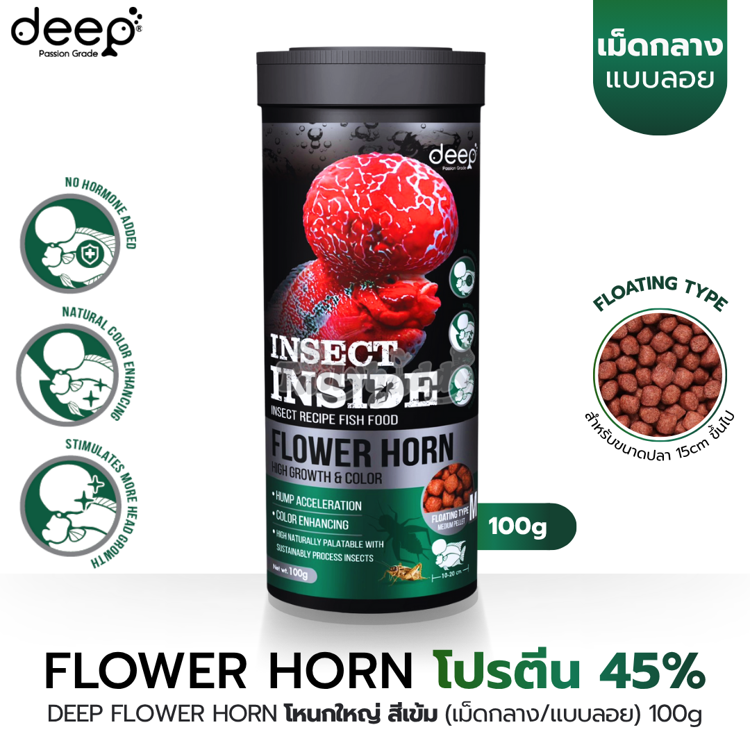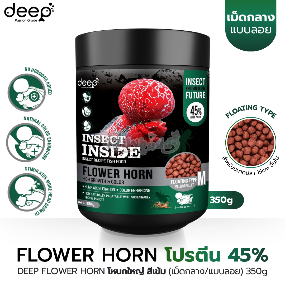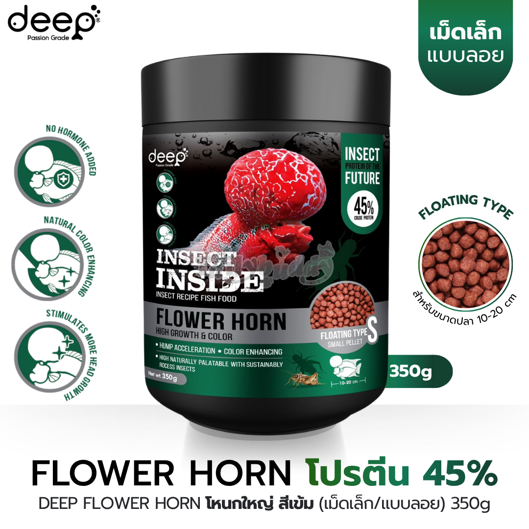 Deep Flower Horn high growth & color อาหารปลาหมอสี สูตรเร่งโหนกใหญ่ เร่งสีเข้ม เร่งโตไว ผสมโปรตีนจากจิ้งหรีด แบบลอย (เม็ดเล็ก, เม็ดกลาง) (100g, 350g)