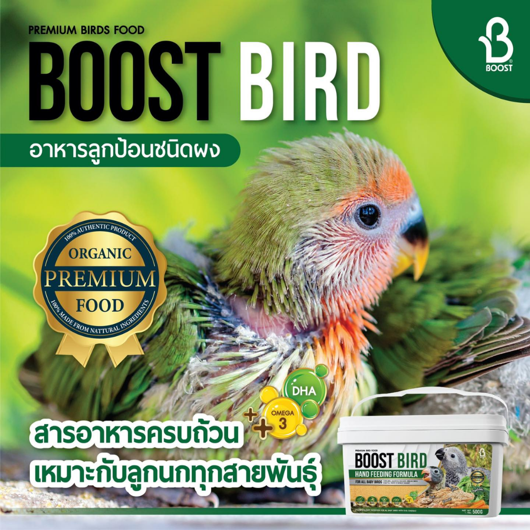 Boost Bird Hand Feeding Formula อาหารลูกป้อน สำหรับลูกนกแก้วนกสายพันธุ์ ชนิดผง เป็นอาหารลูกป้อนที่อัดแน่นไปด้วยสารอาหารครบถ้วนตามที่ลูกนกต้องการ เพื่อช่วยให้ลูกนกเจริญเติบโตได้ไวมีพัฒนาการที่ดี หัดบินได้เร็วและมีขนที่สวยงาม มีกลิ่นหอมและมีรสชาติที่คล้ายอารหารนกโต เพื่อให้ง่ายต่อการเปลี่ยนอาหารช่วงนกหัดเดิน- ผสมจากกล้วย ธัญพืช พีนัท และผักนานาชนิด