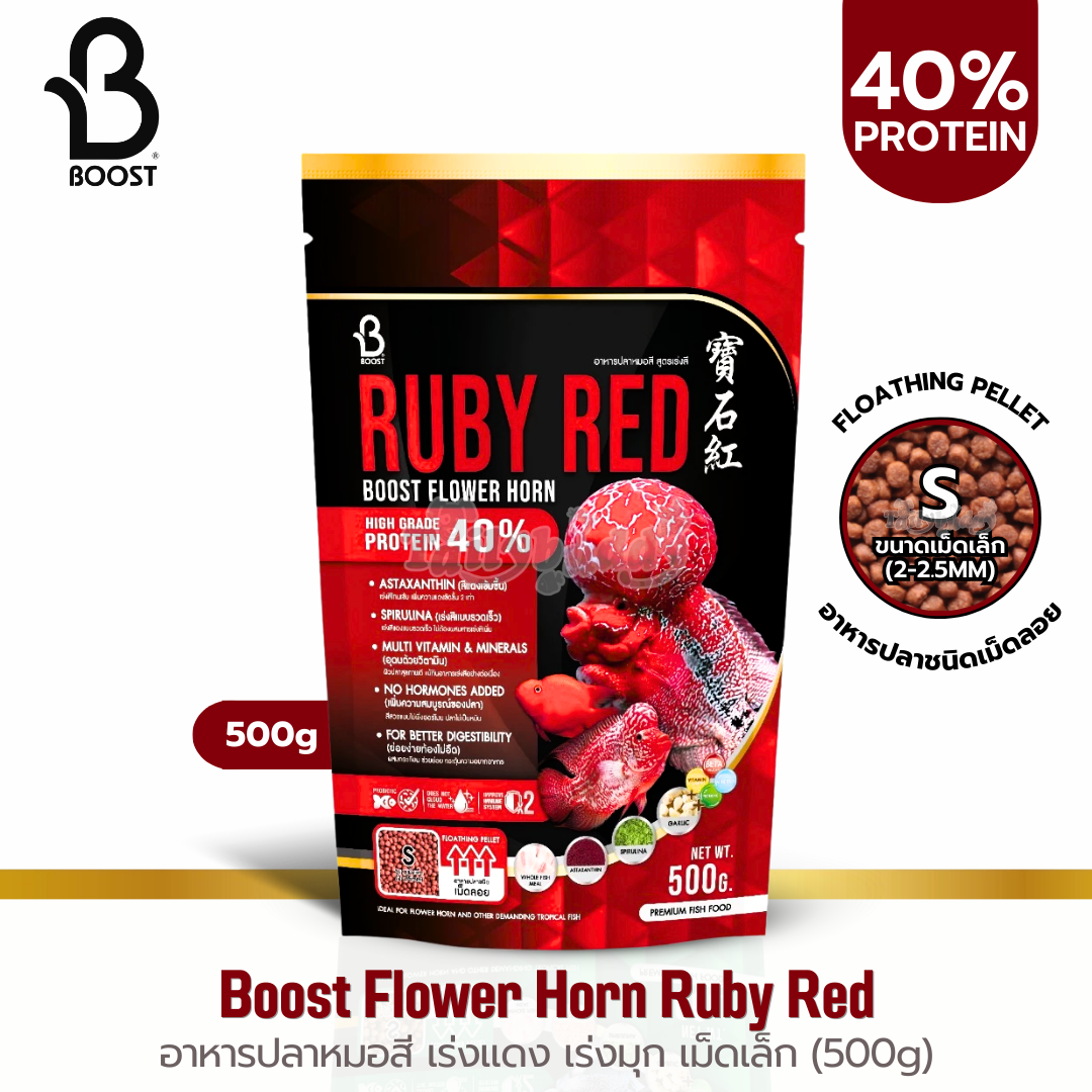 Boost Flower Horn สูตร Ruby Red อาหารปลาหมอสี เร่งแดง เร่งมุก สวยขึ้นใน 10 วัน เม็ดลอย (เม็ด S, เม็ด M) (100g, 500g)