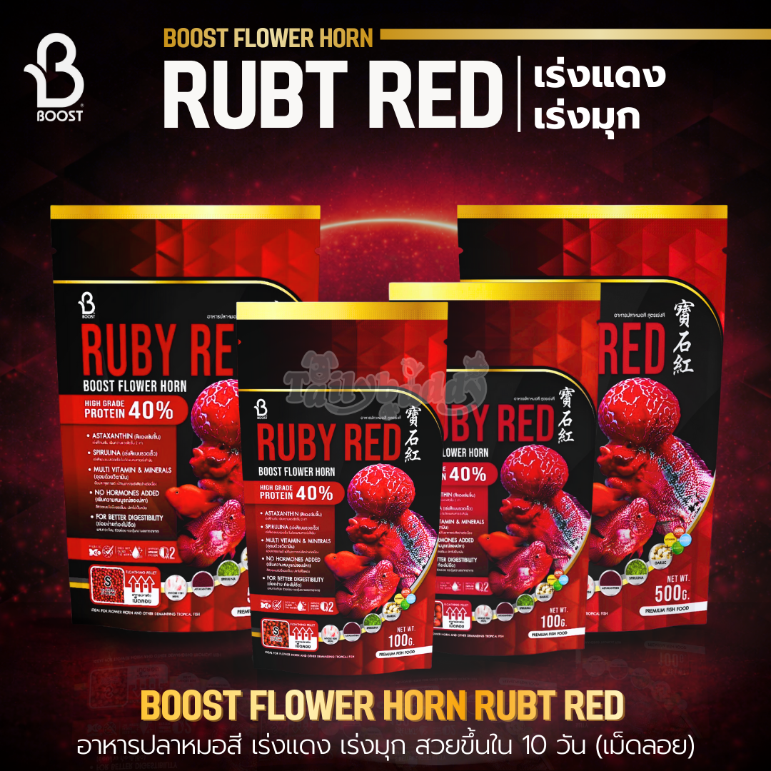 Boost Flower Horn สูตร Ruby Red อาหารปลาหมอสี เร่งแดง เร่งมุก สวยขึ้นใน 10 วัน (เม็ดลอย) ท้าพิสูจน์ใน 10 วัน มาเปลี่ยนปลาหมอสีของคุณให้มีสีเข้ม สวย ฉ่ำ ดุจอัญมณี ไปกับ Boost Flower Horn Ruby Red เร่งแดง เร่งมุก สวยขึ้นใน 10 วัน ไม่ว่าจะสายฟลาวเวอร์ฮอร์น กัมฟา เท็กซัส หรือปลาชนิดไหนที่ต้องการเร่งสีฉ่ำๆ แบบสุขภาพไม่พัง ด้วยสุดยอดวัตถุดิบและสารอาหารคุณภาพ