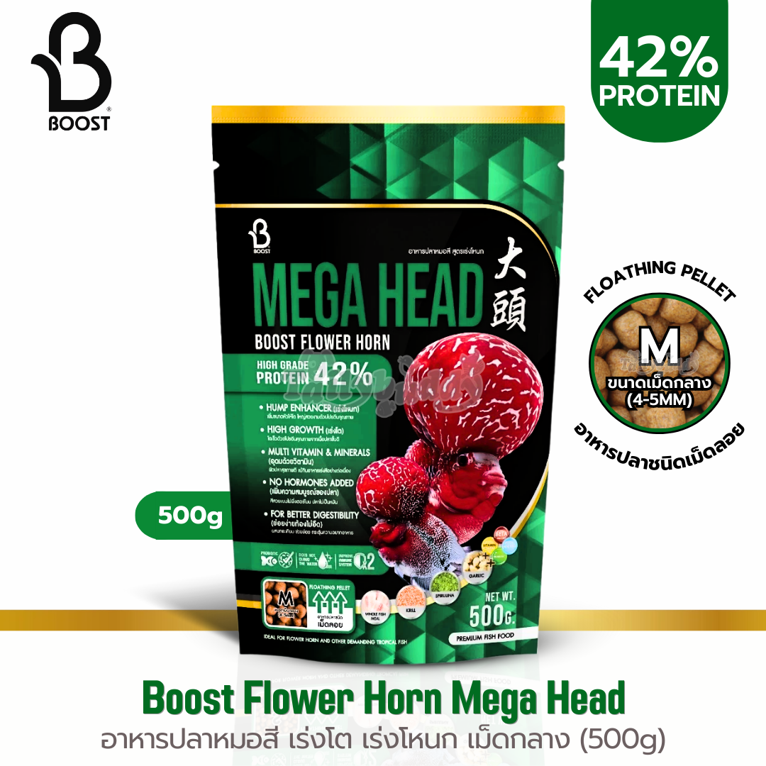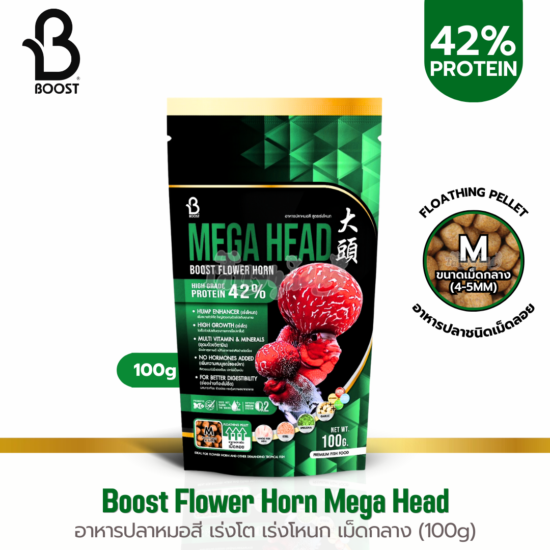 Boost Flower Horn สูตร Mega Head อาหารปลาหมอสี เร่งโต เร่งโหนก สวยขึ้นใน 10 วัน (เม็ดลอย) (เม็ด S, เม็ด M) (100g, 500g)