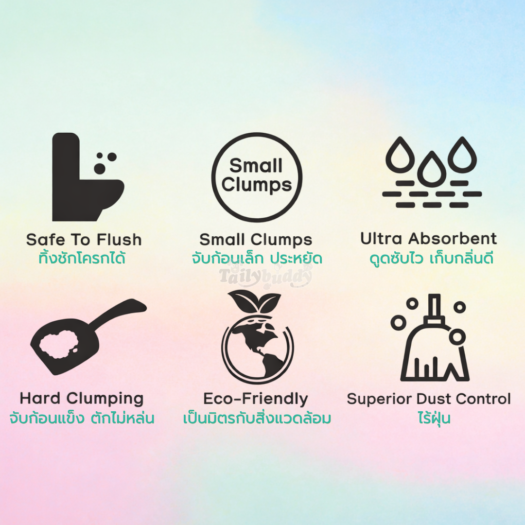 - ไม่ติดเท้าแมว ไร้ฝุ่น ไร้กลิ่นกวนใจ ไม่เหม็น ไม่เป็นคราบติดกระบะทราย