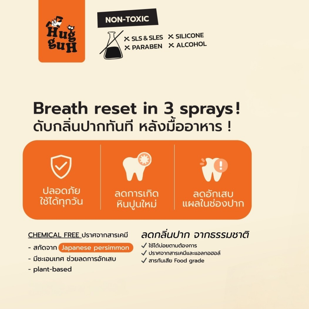 HugguH Mouth Spray สเปรย์ดับกลิ่นปากBREATH RESET IN 3 SPRAYS SUPER NATURAL ปลอดภัยด้วยสารสกัดจากลูกพลับญี่ปุ่น