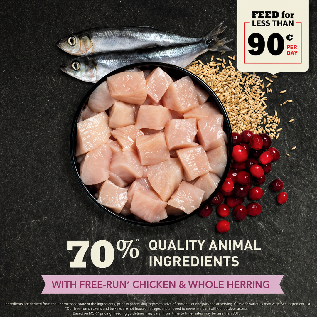 - อุดมด้วยวัตถุดิบจากสัตว์คุณภาพสูง 70% เช่น เนื้อไก่และไก่งวงเลี้ยงแบบปล่อยอิสระ และปลาเฮร์ริงทั้งตัว