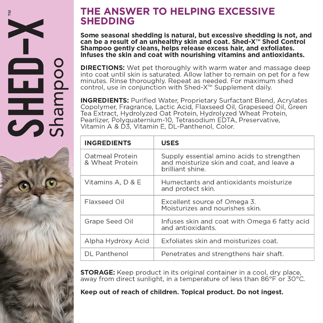 SHED-X Shed Control Cat Shampoo was formulated with veterinarians to infuse the skin and coat with essential amino acids, omega 3 & 6 fatty acids, vitamins A, D and E, and antioxidants. SHED-X Shed Control Cat Shampoo reduces shedding, dander and allergens for cats. It promotes healthy skin and coat and leaves the coat clean, soft and shiny. Also with alpha hydroxyl acids, organic flaxseed oil, grape seed oil and DL panthenol. With a pleasant white ginger and nectarine fragrance.