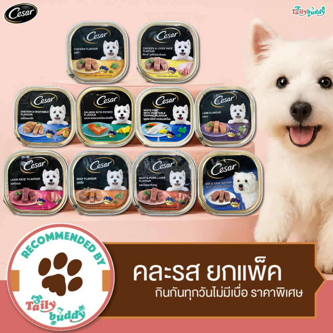 - Cesar อาหารเปียกสำหรับสุนัขอายุ 1 ปี ขึ้นไป ใช้วัตถุดิบที่มีคุณภาพที่ได้รับการคัดสรรมาอย่างดีคลุกเคล้าเป็นเมนูที่เปี่ยมด้วยคุณค่า ให้โปรตีน และสารอาหารที่จำเป็น นอกจากอาหารจะอร่อยแล้วยังมีประโยชน์กับสุนัขอีกมากเพราะมีส่วนประกอบสำคัญมากมาย เช่น เนื้อไก่, เนื้อวัว, ผัก, เจล, น้ำมันเมล็ดดอกทานตะวัน, แร่ธาตุ, สารปรุงแต่งกลิ่นรส, สารถนอมคุณภาพ และวิตามิน ปรุงรสอย่างกลมกล่อมลงตัวและให้โปรตีนกับสุนัขของท่านอย่างแน่นอน ปริมาณอาหารที่ให้ต่อวัน สุนัขน้ำหนัก 1-5 กก. 1-3 ถาดต่อมื้อ , 5-10 กก. ให้ 3-5 ถาดต่อมื้อและน้ำหนัก >10กก. ขึ้นไป ให้5ถาดต่อมื้อ ขึ้นไป(ควรให้ 2 มื้อต่อวัน) Cesar อาหารเปียกสุนัข คละ 8 รส ดังนี้