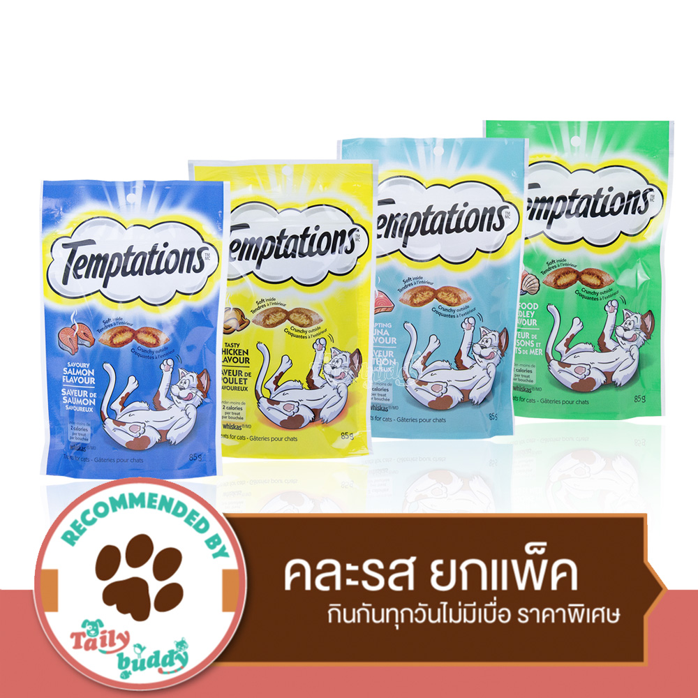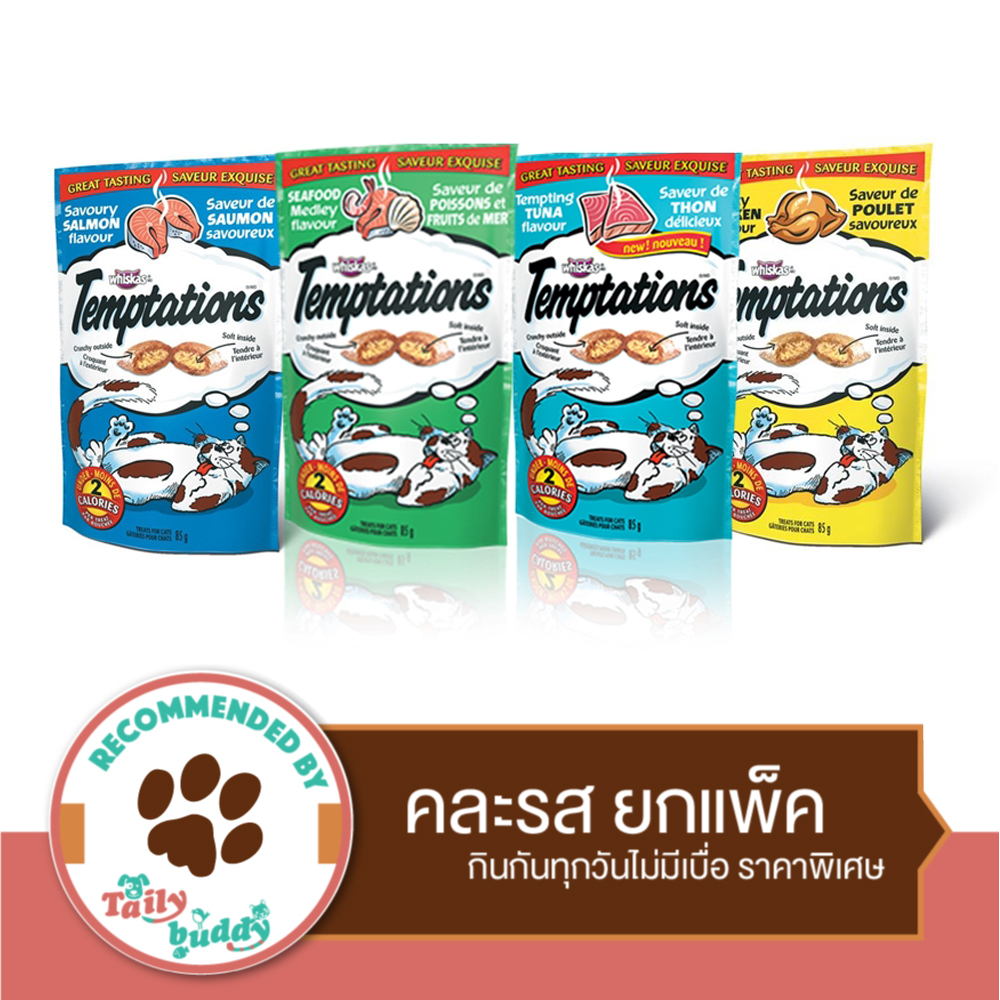 วิสกัส Temptations ขนมแมว คละ 4 รส ยกแพ็ค (75g.x 4 ซอง) ดังนี้- วิสกัส Temptations ขนมแมว รสเชเวอรี่แซลมอน (75g.)