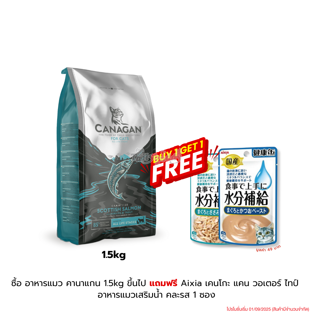 ความชื้น ไม่มากกว่า....................................8.0%วิธีและขนาดการใช้หากเริ่มใช้คานาแกนเป็นครั้งแรก ควรผสมคานาแกนกับอาหารสูตรเดิมทีละน้อย และค่อยๆเพิ่มอัตราส่วนจนเปลี่ยนเป็นคานาแกนทั้งหมด สำหรับลูกแมวกำลังหย่านม ควรนำคานาแกนผสมกับน้ำก่อนให้ลูกแมว สำหรับลูกแมวที่หย่านมแล้ว ควรบดคานาแกนก่อนให้ลูกแมวในสัปดาห์แรกปริมาณการทานอาหารของแมวแต่ละตัวอาจแตกต่างกันตามสายพันธุ์ อายุ กิจกรรม และสภาพแวดล้อมสำหรับลูกแมว อายุลูกแมว ปริมาณ (กรัม) ต่อวัน ต่ำกว่า 2 เดือน 20 - 30 2 - 4 เดือน 30 - 55 4 - 6 เดือน 55 - 75 6 - 12 เดือน 75 ขึ้นไป สำหรับแมวอายุ 1 ปีขึ้นไป น้ำหนักตัว(กิโลกรัม) ปริมาณ (กรัม) ต่อวัน น้อยกว่า 2.5 25 - 35 2.5 - 3.5 34 - 35 3.5 - 4.5 45 - 60 4.5 ขึ้นไป 60 ขึ้นไป Canagan grain freescottish salmon with herring & troutwith sweet potato, vegetables & botanicalINGREDIENTSFreshly Prepared Scottish Salmon (31.5%), Dried Salmon (15%), Dried Herring (15%), Dried White Fish (14%), Sweet Potato, Salmon Oil (5%), Potato, Freshly Prepared Trout (2.5%), Potato Protein, Salmon Stock (2%), Minerals, Alfalfa, Cranberry, Mannanoligosaccharides, Fructoligosaccharides, Apple, Carrot, Spinach, Seaweed, Camomile, Peppermint, Marigold, Aniseed & Fenugreek.ANALYTICAL CONSTITUENTSCrude Protein 37%, Crude Fat 15%, Crude Fibre 1.5%, Crude Ash 9%, Moisture 7%, Omega 6 0.8%, Omega 3 3.1%, Calcium 1.4%, Phosphorus 1%. -