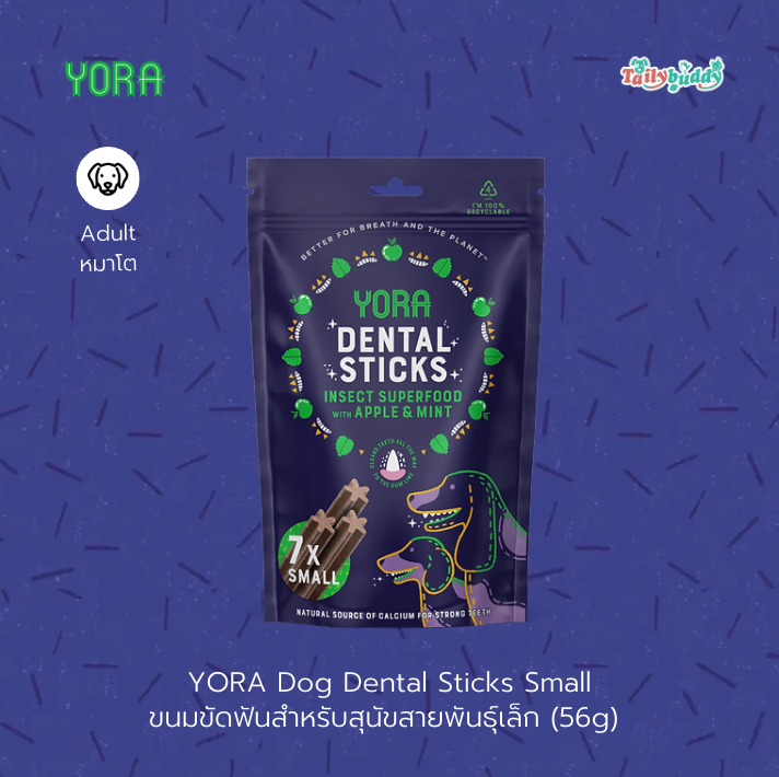 YORA Dog Dental Sticks Small โยรา ด๊อก เดนทัลสติ๊กส์ สมอลขนมขัดฟันจากโปรตีนแมลง มีส่วนผสมของแอปเปิ้ลและมิ้นท์ ช่วยขัดฟัน และทำให้ปากหอม ฟันแข็งแรง สำหรับสุนัขสายพันธุ์เล็ก