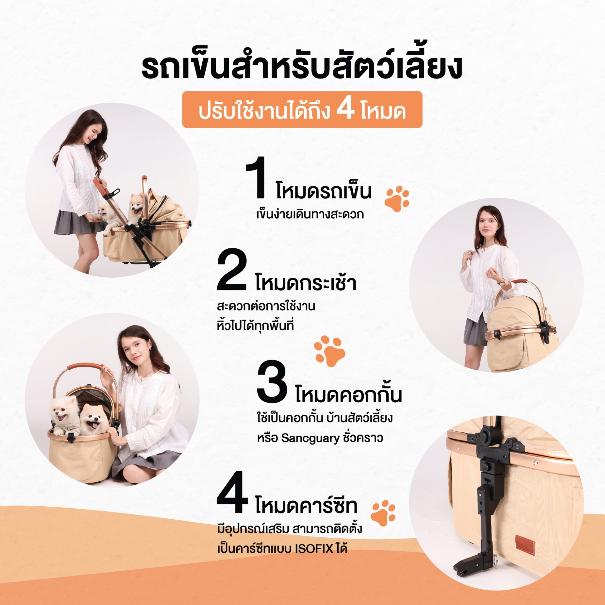 - มี 4 โหมดการใช้งาน ไม่ว่าจะเป็น โหมดรถเข็น , โหมดกระเช้า , โหมดคอกกั้น , โหมดคาร์ซีท